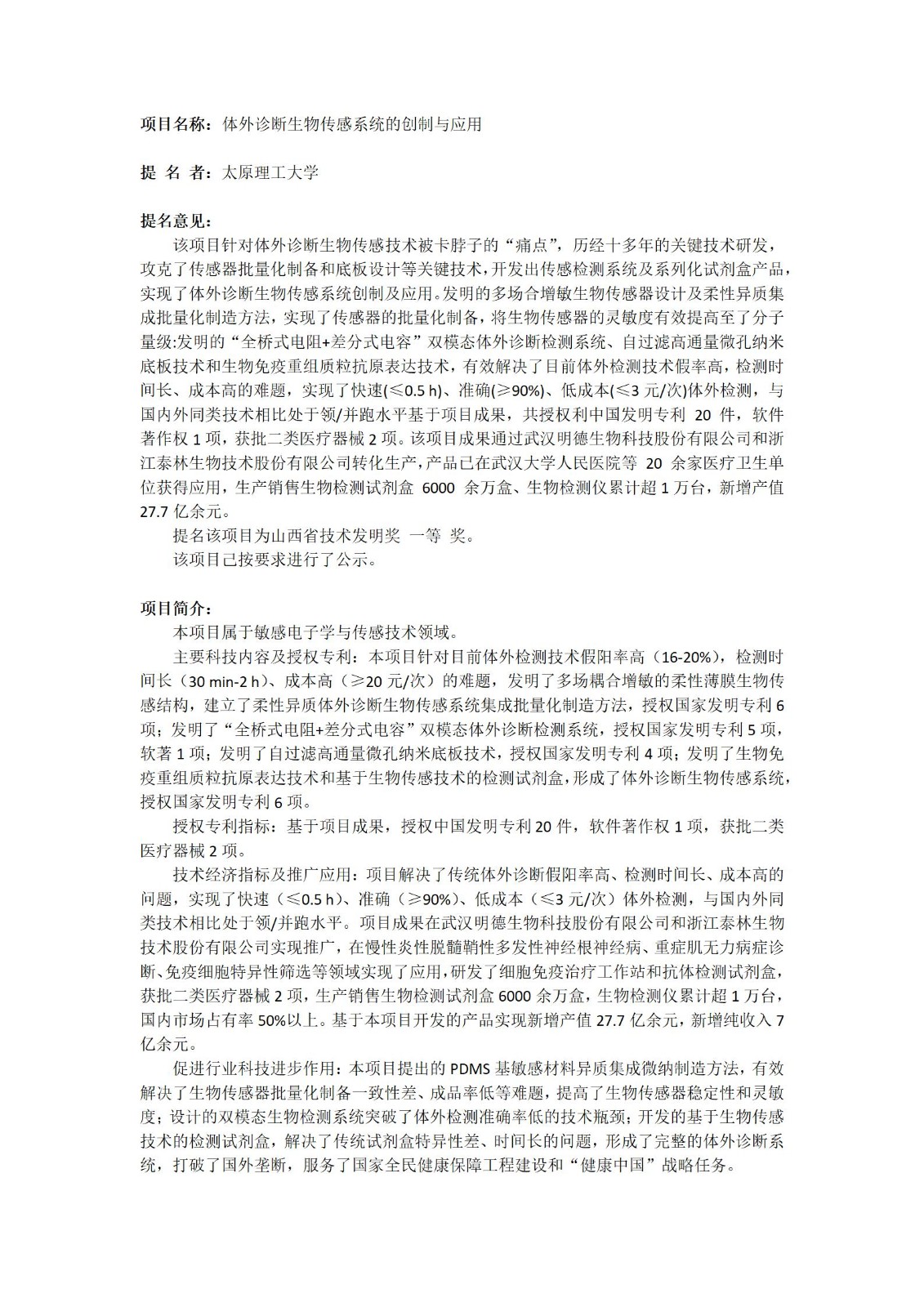 ƾ֤ɽÎ÷Ê¡¿ÆÑ§ÊÖÒÕÌü¹ØÓÚɽÎ÷Ê¡ÊÖÒÕ·¢Ã÷½±ÌáÃûÊÂÇéµÄÏà¹Ø»®¶¨£¬ÈËÉú¾ÍÊDz©¡¢Ì«ÔÀí¹¤´óѧ¡¢Î人Ã÷µÂÉúÎï¿Æ¼¼¹É·ÝÓÐÏÞ¹«Ë¾ÏàÖúÑз¢µÄ¿Æ¼¼Ð§¹û¡°ÌåÍâÕï¶ÏÉúÎï´«¸ÐϵͳµÄ´´ÔìÓëÓ¦Óá±ÄâÌáÃû2024Äê¶ÈɽÎ÷Ê¡ÊÖÒÕ·¢Ã÷½±Ò»µÈ½±£¬ÏÖÓèÒÔ¹«Ê¾¡£¹«Ê¾ÆÚ2024Äê12ÔÂ09ÈÕÖÁ2024Äê12ÔÂ15ÈÕ¡£